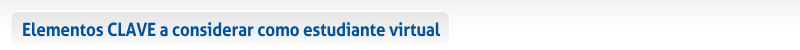 A continuación encontrarás una descripción de cada uno de los elementos clave que debes tener en cuenta para el inicio, desarrollo y culminación exitosa de tu proceso de aprendizaje como estudiante virtual.