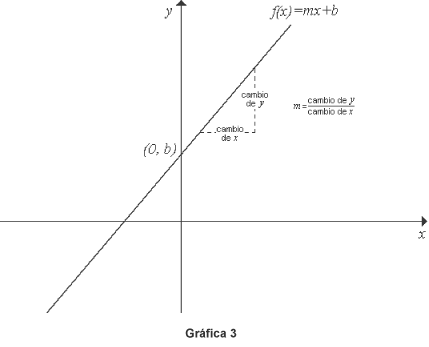 Una función es lineal si su regla de asignación tiene la forma f(x) = mx + b y su gráfica es una línea recta. En la ecuación, m es la pendiente de la recta y b es el corte de la recta con el eje y, ver Gráfica 3.