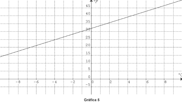 Como la relación es lineal los puntos (0,32) y (5,41) pertenecen a una línea recta con eje horizontal las temperaturas en grados Celsius y eje vertical las temperaturas en grados Fahrenheit.