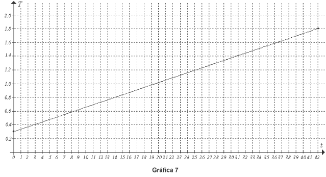 c. Se observa que la relación entre T y t es lineal porque la tapa del casco crece 1 cm cada mes, es decir crece 1/28 cm cada día. La expresión que relaciona las variables es de la forma T(t) = mt + b donde la pendiente es m = 1/28 y b = 0.3. Por tanto, T(t) = 1/28t + 0.3 para 0 ≤ t 42 y su gráfica es la Gráfica 7.