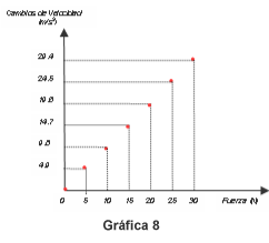 a. Usando los datos de la Tabla se tiene el registro gráfico de los Cambios de Velocidaden función de la Fuerza, ver Gráfica 8.